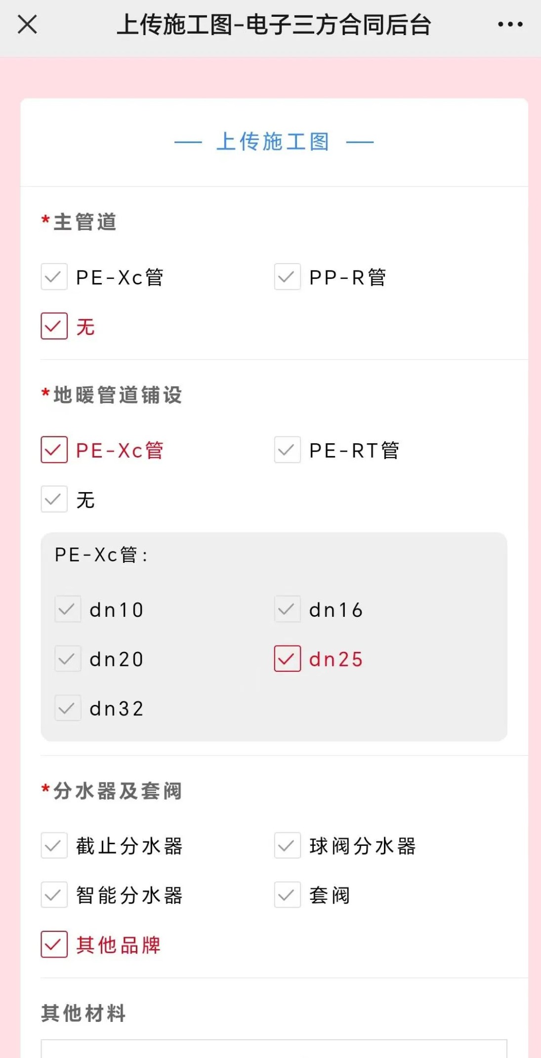说明:主管道未用到海利克斯姆管材,选择☑无,分水器及套阀未用到海利克斯姆品牌可选☑其他品牌