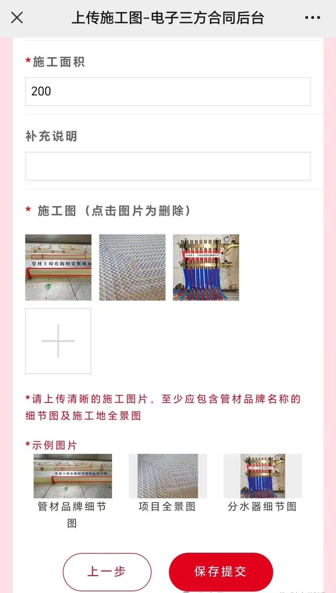 施工图上传说明:需上传管材铺设场景图、管材/分水器/PPR管印有海利克斯姆LOGO细节图。