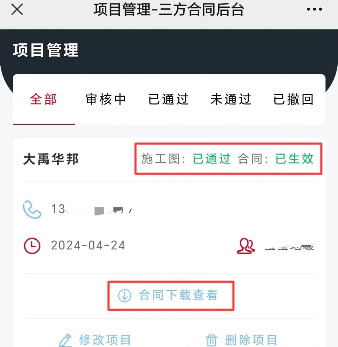 施工图/合同审核通过后,将签字链接点击复制,通过微信发给客户签字,签字后合同生效,如需查看合同内容,可点击合同下载。